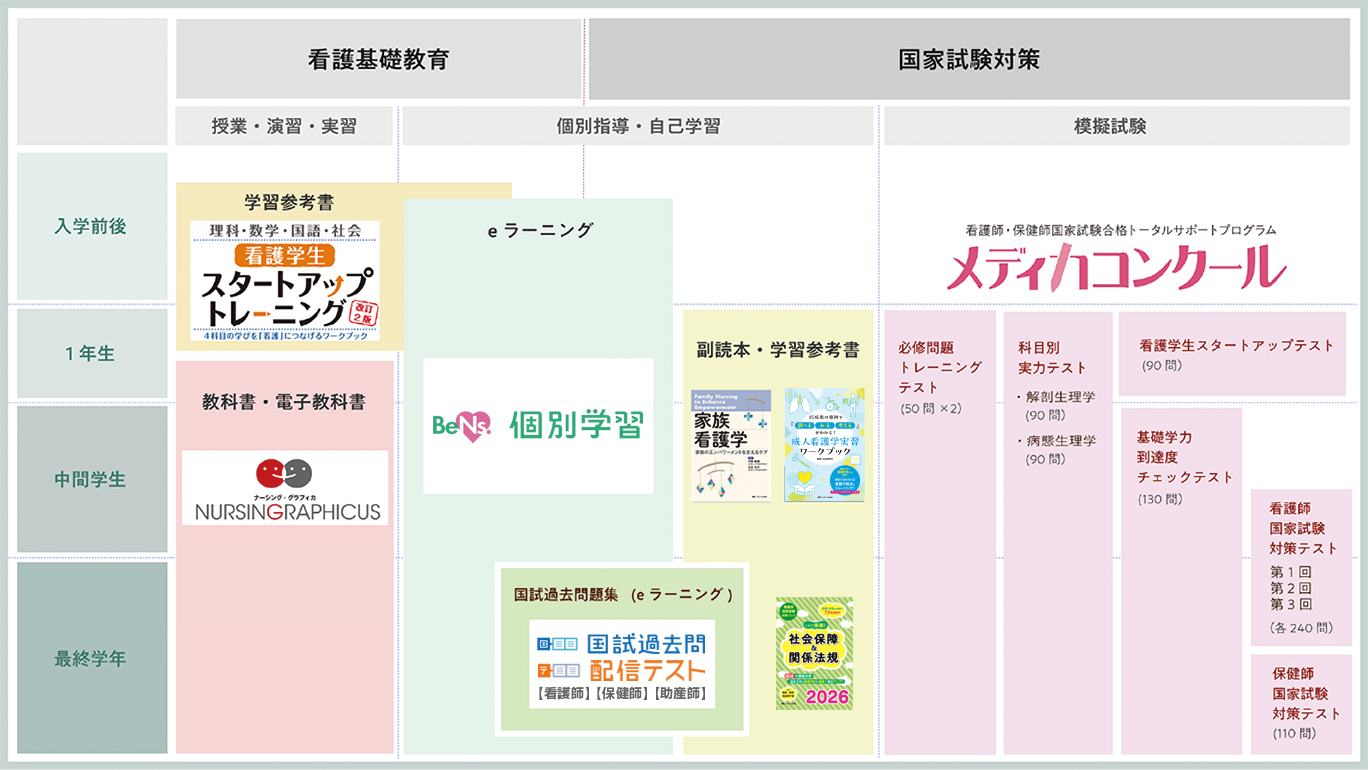 看護基礎教育における「授業支援・国試対策・自己学習」をワンストップでサポートします。