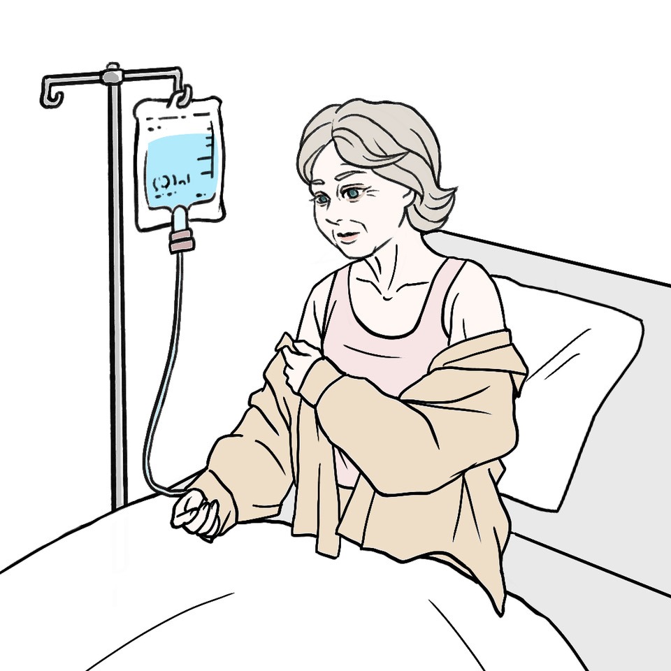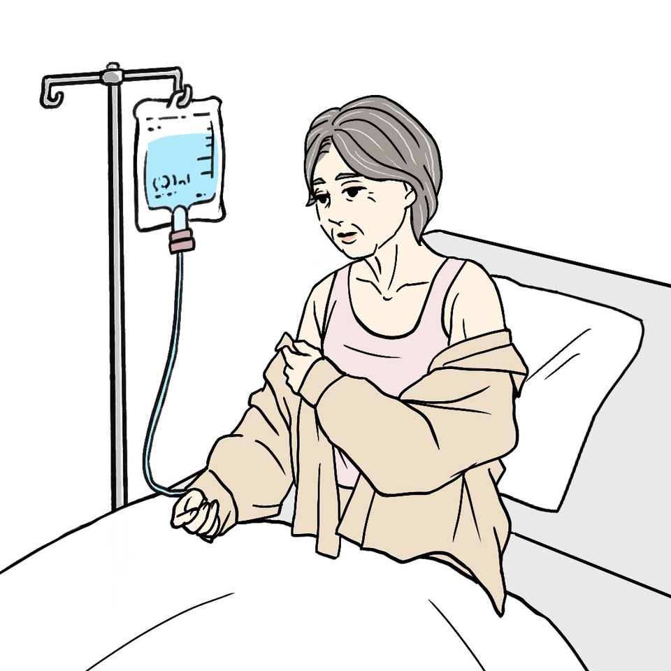 ③You are on an IV drip. I am going to help you to take off and get on your pajama tops.