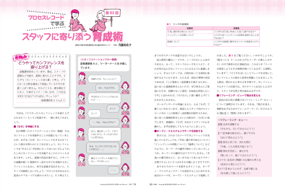 今回ご紹介するのは、Nursing BUSINESSの連載『どうやってカンファレンスを盛り上げる?』(2025年4月号)です。著者は、看護教育やシミュレーション教育を通じて指導者の育成に取り組んでいる、内藤知佐子氏です。