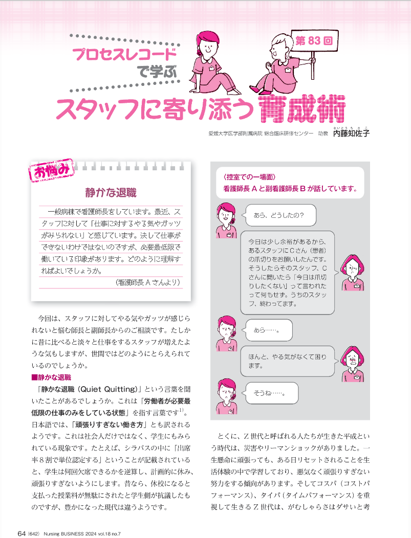今回ご紹介するのは、Nursing BUSINESSの連載『プロセスレコードで学ぶスタッフに寄り添う育成術:静かな退職』(2024年7月号)です。著者は看護教育やシミュレーション教育を通して指導者の育成に取り組んでいる、内藤知佐子氏です。