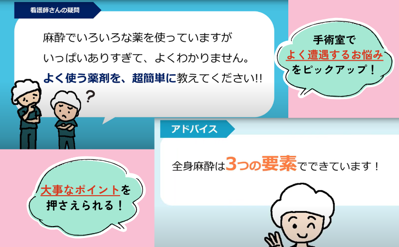 「麻酔にはどんなものがある?」「麻酔でよく使う薬剤は?」「どのタイミングで気管挿管するの?」など、ナースが手術室でよく遭遇するギモンに経験豊富なエキスパートが答えて解説しています♪