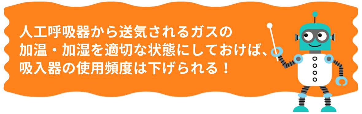 分泌物を24時間正常な状態に保ち、分泌物を容易に吸引できるようにするには、人工呼吸器から送気されるガスの加温・加湿を適切な状態にして送ることが一番大事です。