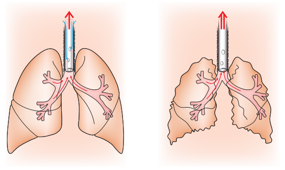 したがって、気管吸引中にできるだけ肺胞の虚脱を起こさないために、気管チューブと気管吸引チューブにはしっかりと隙間をつくり、開放式気管吸引では気管チューブの接続口から大気を、閉鎖式気管吸引では人工呼吸器から送気される空気を吸えるようにしなければなりません。