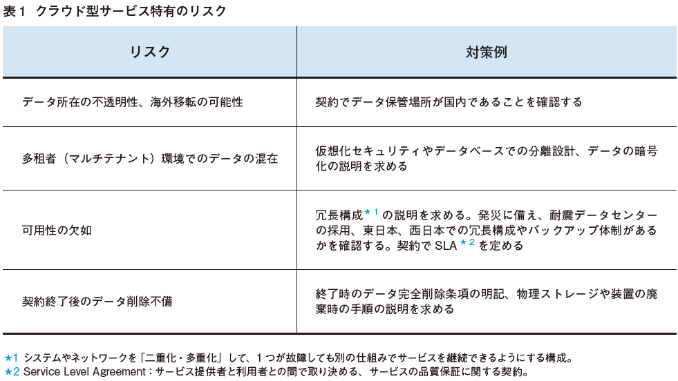 クラウド型サービス特有のリスクを表1にまとめた。事業者に問い合わせる際に参照いただきたい。