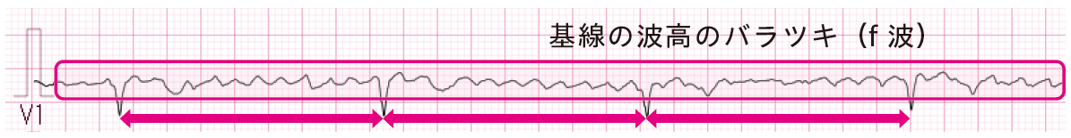 *心房粗動のF波との鑑別も必要であるが、V1誘導(1番明瞭)で基線の波高のバラツキがあり、f波を考える。