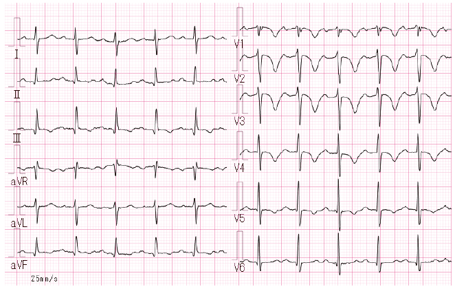 際の胸部圧迫感を訴えて救急受診した際の心電図を示す。