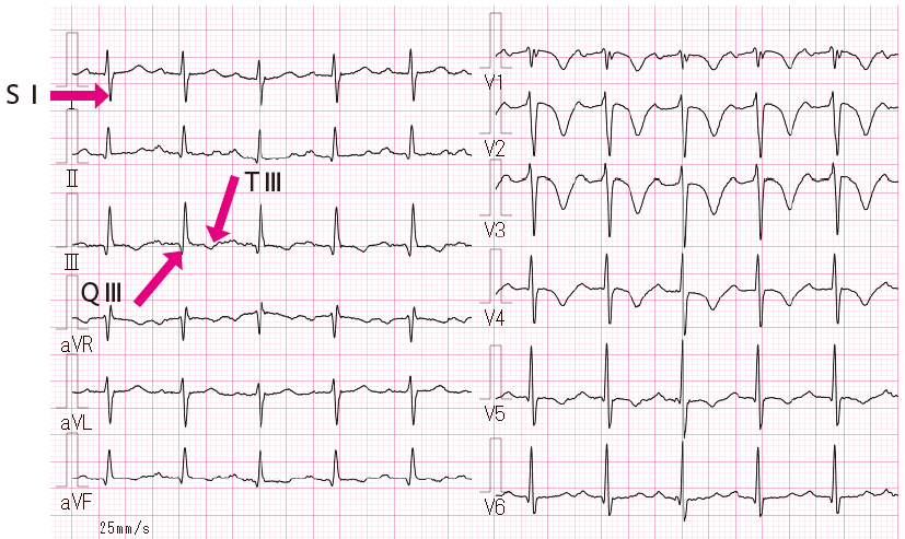 主要所見:主要所見:洞頻脈(100 回/ 分以上)、SⅠQⅢTⅢ、陰性T波〔(Ⅱ)・Ⅲ・aVF・V1~V5誘導〕