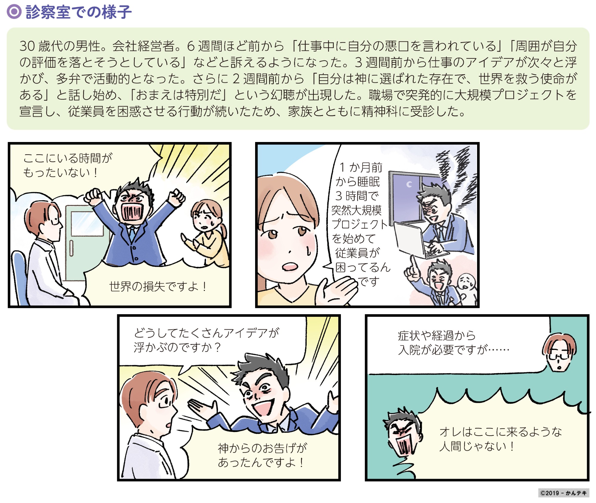 統合失調感情症は、幻覚や妄想などの精神症症状と、うつや躁などの気分症状 が同時に現れる時期と、気分症状がなく精神症症状だけが現れる時期とをあわ せもつ病気である。治療で安定を目指せる。