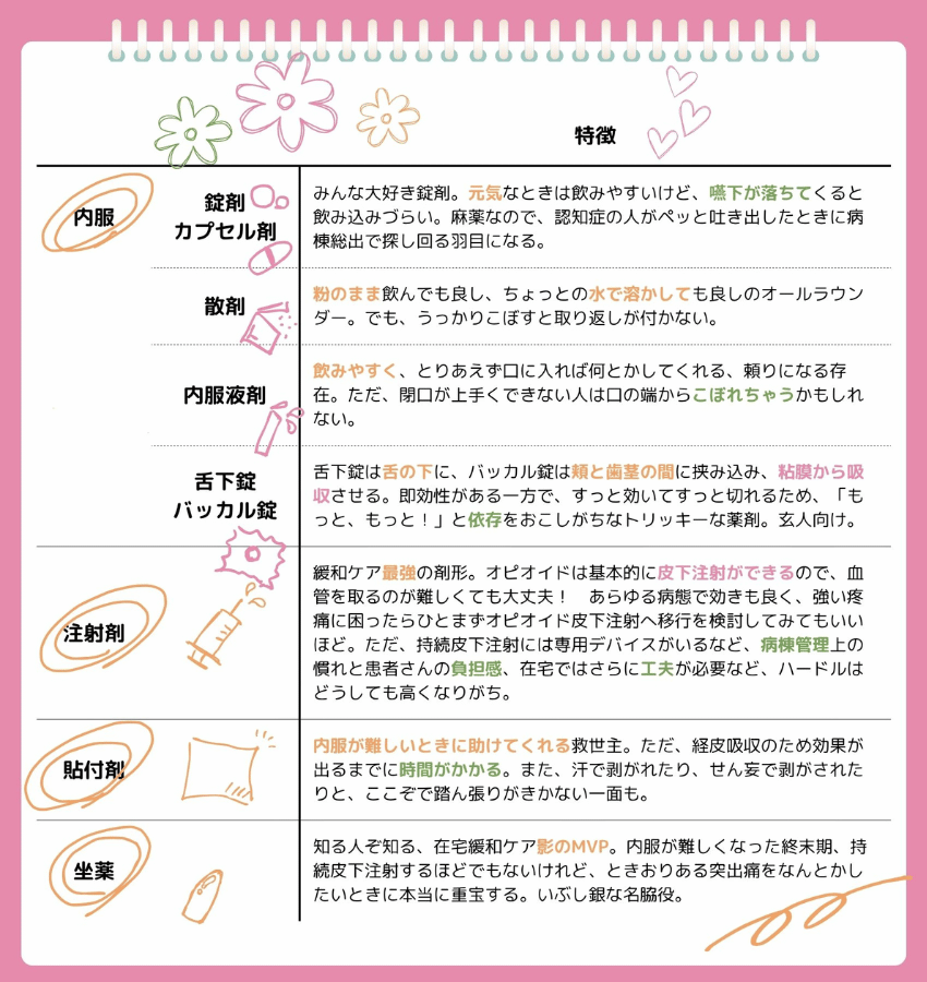 内服液剤は、患者さんが痛みや呼吸困難感で焦っているときでも内服しやすいと評判だよ。それに言わずもがな、貼付剤は内服ができない時の強い味方だよね。