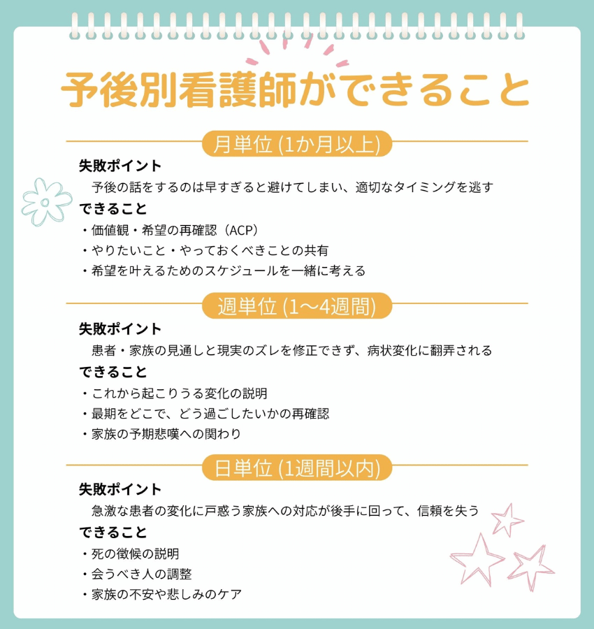 もちろん、主治医の意向もあるだろうから、その返答も正しいと思うよ。でもやっぱり、看護師もプロの医療従事者だからね。患者さんに最期の大切な時間を有意義に過ごしてもらうためにも、きちんと残りの時間を意識した看護ができたほうがいいよね。