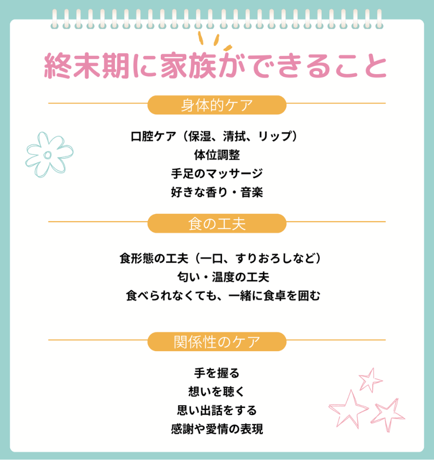 医療者は責任感が強いから、つい「ご家族の手を患わせないように」って考えてしまいがちだよね。でもね、医療者にご家族の代わりはできないんだよ。患者さんの人生最期の時間だからこそ、ご家族にしかできないケアがたくさんあるんだ。