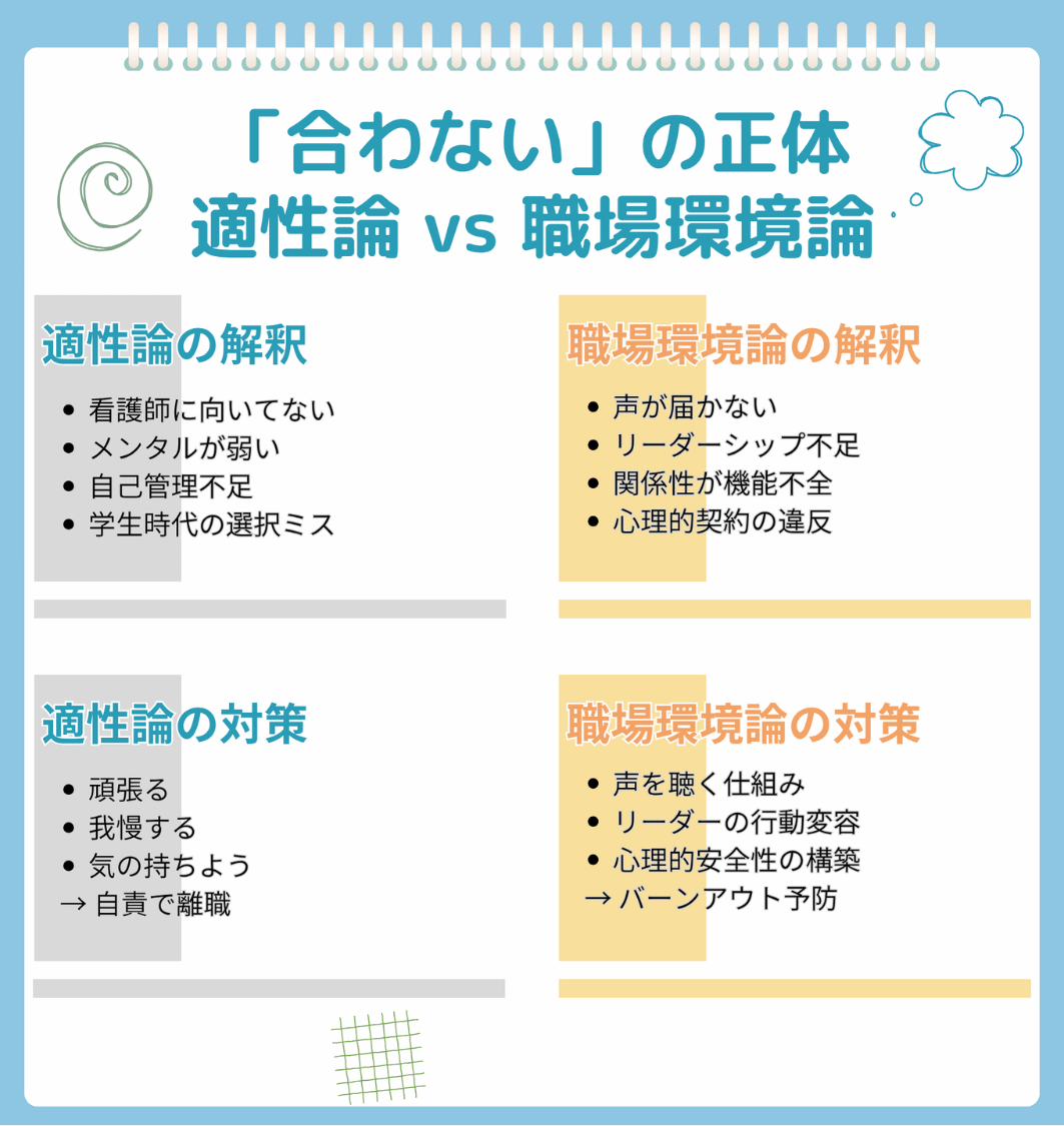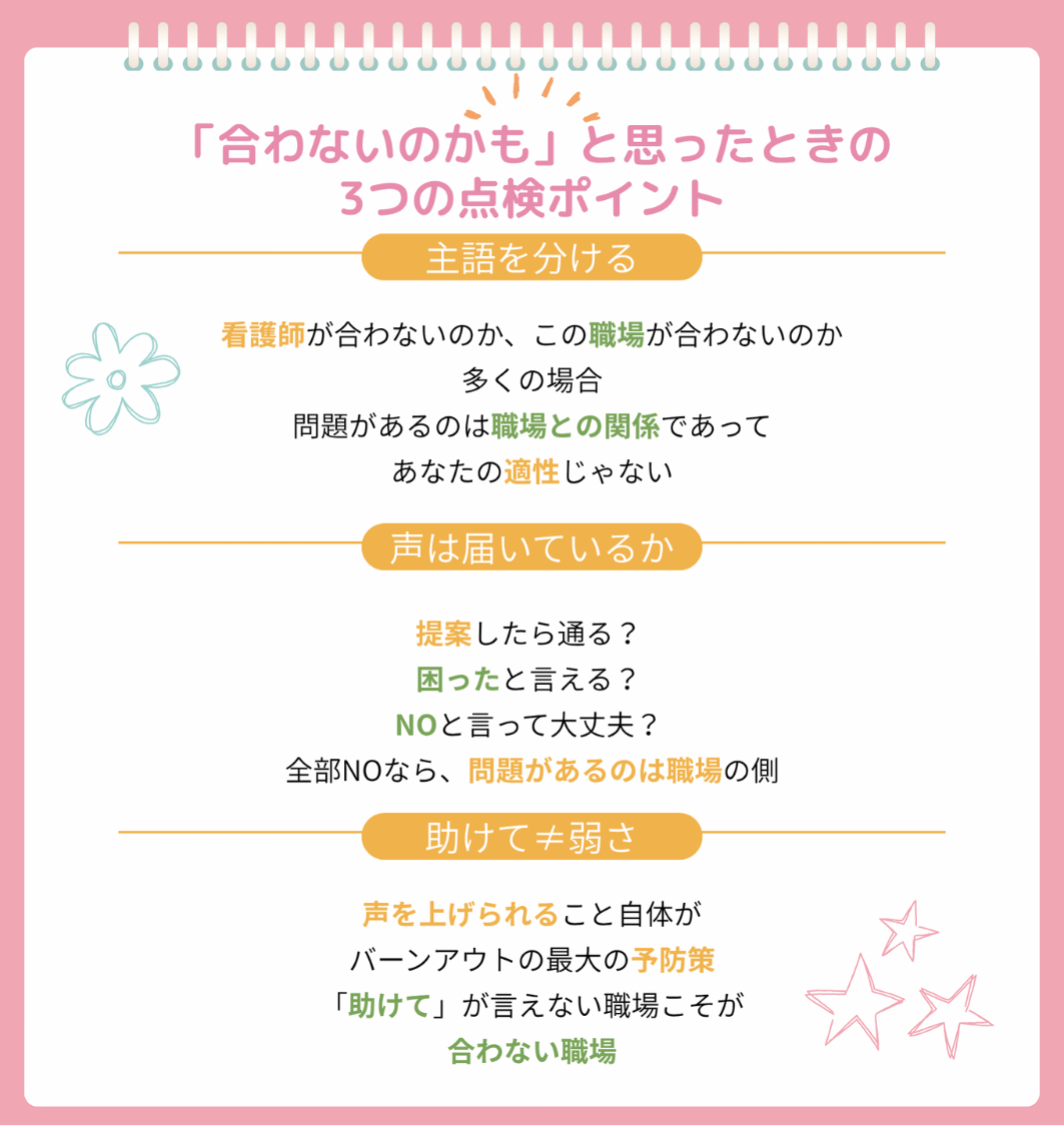 「看護師が合わない」と「職場が合わない」って、「体調が悪い」と「対応が悪い」ぐらい違いますからね。