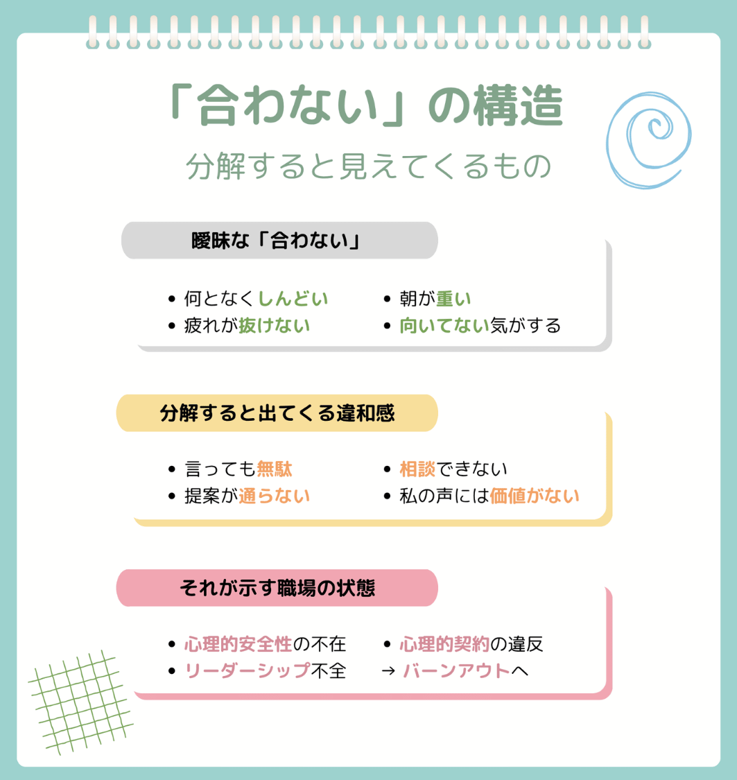 明日から使える話に落とそう。「合わないのかも」って頭をよぎったとき、自分を責める前に点検してほしいことが3つあるよ。