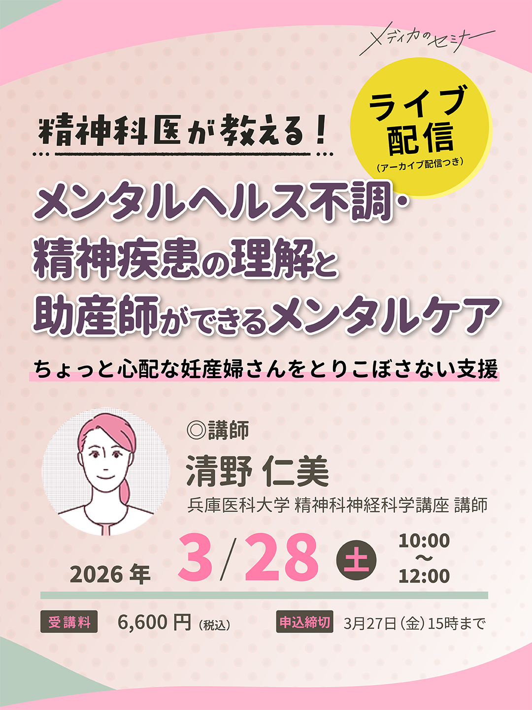 本セミナーでは、総合病院精神科にて妊産婦の精神科診療を担当されている清野仁美先生を講師にお迎えし、周産期に関わる支援者として押さえておきたいポイントを体系的に解説いただきます。具体的には、「病態の基本」「薬剤の知識」「本人・家族への説明」「実はここまで対応してほしい」の4つの観点から、現場での判断と支援につながる実践的な内容を取りあげます。